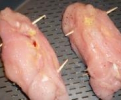 Piersi z kurczaka rozbić na cienkie płaty, pokroić jeśli będą zbyt duże. Przyprawić solą, pieprzem, ziołami wedle uznania. Z jednej strony posmarować musztardą na calej powierzchni. Ułożyć około 1-1,5 plastra mozarelli i kawałek papryki na każdym plastrze. Zawinąć szczelnie i przekłuć w poprzek wykałaczkami, żeby się nie rozleciało w czasie gotowania.