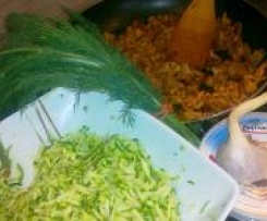 2. Cukinię ścieramy na tarce o grubych oczkach, wkładamy do miski solimy i wstawiamy do lodówki, aby puściła sok. Zostawiamy na 30 minut. Po tym czasie odsączamy w durszlaku.