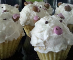 gotowym kremem posmaruj wierzch babeczki, wbij migdały i polukruj je różowym lukrem, na lentylkach namaluj 2 kropki roztopiona czekolada, ta samą czekoladą namaluj oczy.