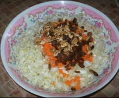 "Blokada naczynia miksującego" wlozyc marchew, w kawalkach: 3-4 sek / obr 5, dodac do selera i kopru. Do miski z warzywami dodac rodzynki, orzechy polamane rekoma, doprawic olejem, cukrem, sola, pieprzem i sokiem z cytryny.