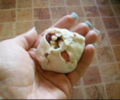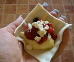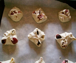 "Blokada naczynia miksującego" wlozyc cukier i skòrke: 20sek / obr 8. Dodac pozostale skladniki na krem: 6min / 90° / obr 4, wyjac, wystudzic. Ciasto pokroic na kwadraty ( ok. 10x10cm), na kazdy nakladac po ok. 1 lyzce kremu, troche owocòw, na wierzch troche migdalòw. Zamknac " byle jak, nie musi byc zamkniete ròwniutko). Piec w nagrzanym piekarniku: 180° / 15min. Wyjac, przestudzic, udekorowac cukrem pudrem.