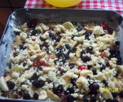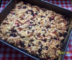 Ciasto wylać na blachę, na cieście ułożyć owoce , a na owocach kruszonkę.
