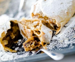 Do naczynia miksującego włożyć masło, roztopić 4 min/60°/obr1. Ciasto posmarować roztopionym masłem, wyłożyć na nie jabłka, pozostawiając ok 10 cm wolnego ciasta na jednym z brzegów. Jabłka posypać migdałami. Przy pomocy ścierki zwinąć strudel, aby ciasto bez nadzienia pozostało na ostatnie zawinięcie. Wierzch posmarować roztopionym masłem. Przełożyć na blachę posypaną mąką (można zwinąć w łuk). Wstawić piekarnika nagrzanego do temperatury 180°C. Piec około 35 min. Lekko wystudzone ciasto obficie posypać cukrem pudrem.