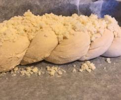 Podzielic ciasto na 3 rowne czesci i utworzyc z nich walki. Na blaszce wylozonej papierem do pieczenia polozyc 3 walki. polaczyc konce ze soba i splesc jak warkocz. koncowki znow ze soba polaczyc.