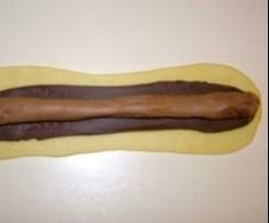 Na blacie podsypanym mąką ułożyć jasne ciasto, na nim ciemne a na środku wałeczek jasnego z kakao. Zawinąć je w roladkę zlepiając jasne ciasto.