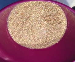 Kaszę płuczemy na sitku, przesypujemy do miski i zalewamy 700 ml wody, mieszamy.