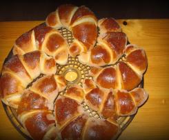 "Blokada naczynia miksującego" wlać mleko, dodać pokruszonone drożdże, masło i cukier. Podgrzewać 3 min/37 stopni/obr.2 - Dodać mąkę i sól, wyrobić 3 min/interwał