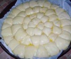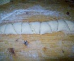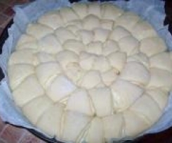 "Ciasto" . Przelozyc do miski, zostawic do wyrosniecia (az podwoi objetosc). Wyrobic chwilke, podzielic ciasto na 5 czesci. Kazdy rozwalkowac, jak na zdjeciu, posmarowac farszem, zwinac w rulonik, pokroic, jak na zdjeciu. Poukladac w okraglej foremce, wg zdjecia. Zostawic do wyrosniecia. Posmarowac roztopiona margaryna, piec w goracym piekarniku: 200° / ok. 30-40min ( do zrumienienia).Nadzienie: do