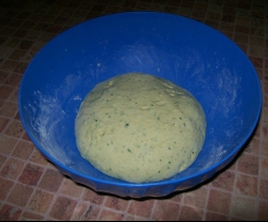 "Ciasto" . W czasie tych 3min., dodawac przez otwòr, stopniowo, cukinie. Wyjac ciasto ( bedzie dosc miekkie), przelozyc do miski, przykryc sciereczka, zostawic do wyrosniecia. Gdy podwoi objetosc, podzielic na 18 czesci, uformowac buleczki, ukladac na blaszce wylozonej papierem. Przykryc sciereczka, zostawic na ok. 1 godz. do wyrosniecia. "Ponacinac" buleczki, piec w nagrzanym piekarniku: 190° / 30-40min.
