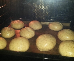 2. wyrobić 4min/przełozyc na stolnice,uformowac wałek i kroić kawałki,formować bułeczki,wyłozyc na blachę do wyrośnięcia jak wyrosną ponacinać posmarować białkiem,włozyć do piekarnika nagrzanego do 200st piec ok 20min do zrumienienia