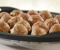 "Obroty wsteczne" /obr. 4. Wilgotnymi dłońmi formować klopsiki (Ø 3 - 4 cm), układać na górnej części Varomy. - Do naczynia miksującego wlać wodę i dodać bulion mięsny, włożyć koszyczek, odmierzyć do niego ziemniaki. Nałożyć przystawkę Varoma, gotować na parze 30 min/Varoma/