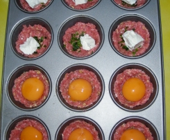 Gniazda do muffinek posmarować olejem, wyłożyć mięsem mielonym, zrobić w środku dołek i włożyć nadzienie w postaci żółtka lub kawałka fety i posiekanej pietruszki.