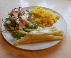 Do naczynia wlać litr wody, pół łyżeczki soli, włóżyć koszyczek z ryżem, posypać kurkumą, zamkąć pokrywę. Na to stawiamy varomę, z kurczakiem i fasolką. Gorujemy 30 minut/Varoma/Obroty 1. W czasie kiedy roladki się gotują (parują) połączyć jogurt naturalny z czosnkiem i szczyptą soli. Umyć sałatę bądź rukolę. Ryż jest gotowy po 15-20 minutach, wyjąć ryż i ponownie postawić varomędo końca czasu.