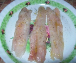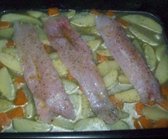 Rybe umyc, osuszyc, posolic, popieprzyc, nasmarowac polowa oliwy, skropic sokiem z cytryny, odlozyc. Ziemniaki obrac, umyc, pokroic na czesci, wlozyc do