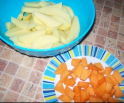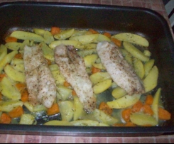 "Obroty wsteczne" / obr 1. 5 min. przed koncem dodac pokrojona w gruba kostke dynie. Wyjac, przelozyc do brytfanki, na wierzch ulozyc filety, polac oliwa, posypac tymiankiem. Piec w goracym piekarniku: 200° / 25-45 min. 5-8 min przed koncem wlaczyc tylko gòre lub grill. Leciutko zapiec. Posypac swieza pietruszka.