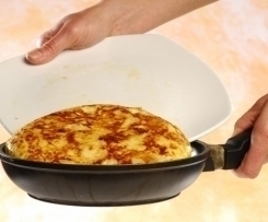 5. Do naczynia miksującego wbić jajka, wymieszać 15s/obr.3, jajka dodać do ziemniaków i wymieszać. Wlać 1 łyżkę oliwy z oliwek na rozgrzaną patelnię, nałożyć masę z jaj i ziemniaków. Smażyć, aż placek nabierze złocistego koloru. Na patelnię nałożyć dnem do góry talerz i odwrócić patelnię, aby omlet znalazł się na talerzu. Na patelnię wlać 1 łyżkę oliwy z oliwek, omlet delikatnie zsunąć z talerza na patelnię i smażyć z drugiej strony, aż nabierze złocistego koloru. Położyć omlet na talerzu, pokroić na ćwiartki, podawać na gorąco.