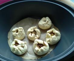 4 min/varoma/obr. 1 - Ciasto dzielimy na 12-14 czesci i formujemy z nic okragle "placki", na kazdym umieczczamy czesc farszu i tworzymy nie zamknieta sakiewke. Sakiewki ukladamy na patelni i lekko spody pdsmazamy spody.