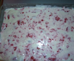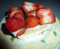 Tortownicę lub inną blaszkę (u mnie naczynie żaroodporne prostokątne) wyłożyć biszkoptami, przelać powoli masę i powtykać połowę pokrojonych truskawek i wstawić do lodówki, aby masa się stężała. Nastepnie ułozyć resztę pokrojonych truskawek i zalać galaretką, schłodzić.