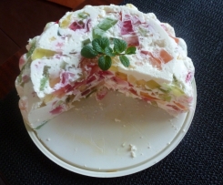 6) Powstałą masę wymieszać w dużej misce z galaretkami i przełożyć do przygotowanej formy do tortów na zimno. Pozostawić na kilka godzin w lodówce - ja zostawiam na noc