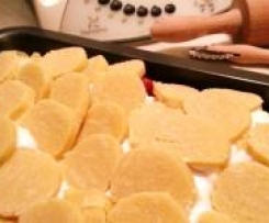 Drugą połowę ciasta wałkujemy na stolnicy w wielkości formy do pieczenia i wykładamy nią ciasto.