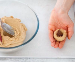 7. Z masy formować kulki (najlepiej wilgotnymi dłońmi) o średnicy 4-5 cm i nadziewać je nutellą (jak na zdjęciu).