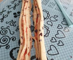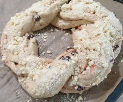 - Wyrośnięte ciasto przełożyć na blat i rozwałkować. Na rozwałkowanym cieście rozsmarować dżem. Zwinąć jak roladę. Przełożyć na wcześniej przygotowaną blachę z papierem. Roladę przekroić wzdłuż. Powstałe 2 części zapleść i połączyć tak aby powstał wieniec. Odstawić do wyrośnięcia na ok. 15 min. W tym czasie rozgrzać piekarnik do temp. 180°C.