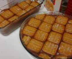 przygotowac prostokatna forme ok. 20x30 cm. Rozmieszac mleko z kakao (jak nie ma w domu dzieci mozna zastapic kawa z rumem). moczyc ciastka i ulozyc na dnie formy. przelozyc jedna trzecia czescia masy czekoladowej i nastepnie znow ulozyc ciastka zamoczone w mleku i kakao. Tak zrobic trzy warstwy. jakby na masie czekoladowej zrobila sie skorka to mozna przed kazdym przelozeniem zamieszac kilka sekund na obr. 6. ostatnia warstwe masy czekoladowej przykryc ciastkami