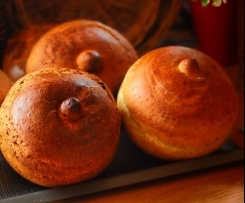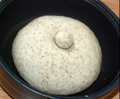 Z ciasta formujemy dwie kule. Każdą umieszczamy pośrodku w naczyniu, w którym będzie pieczony chlebek. Z pozostałej części ciasta formujemy uchwyty (patrz zdjęcie). Dalej wbijamy pośrodku kuli palec aż do dna aby powstał otwór (jeżeli ciasto się klei do palca posmaruj go lekko olejem). W powstały otwór wkładamy nasze uchwyty. Tak przygotowane ciasto smarujemy jajkiem rozbitym z łyżką wody lub po prostu samą oliwą z oliwek.