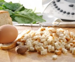 - Dodać rozdrobnione bułki, jajka, 1 łyżeczkę soli, pieprz i gałkę muszkatołową, rozdrobnić 15s/