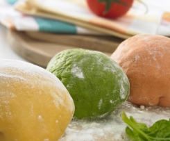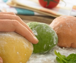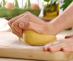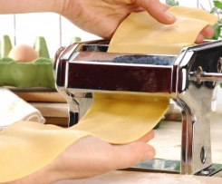 "Ciasto" . Ciasto uformować w kulę, zapakować w folię spożywczą i pozostawić na 15 minut. - Za pomocą wałka lub maszynki do makaronu rozwałkować ciasto na posypanej mąką powierzchni na cienkie, prostokątne kawałki. Posypać ciasto makaronowe mąką, żeby się nie sklejało. Można również użyć maszynki do makaronu. Rodzaje makaronu: Lasagne lub ravioli: pokrojone w kwadraty (około 20 x 10 cm)Tagliatelle: pokrojone w paski (2 x maks. 30 cm)Farfalle: pokrojone w małe prostokątne kawałki (2 x 5 cm), ściśnięte w środku tak, aby utworzyły kształt motyla.