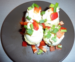 Zdobimy kleksem majonezu, pokrojoną w kostkę czerwoną papryką i pokrojonym szczypiorkiem.