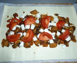 Farsz przełożyć do miski, z tymianku usunąć łodyżkę, dodać pieczarki i przyprawić pieprzem i odrobiną soli (nie za dużo ponieważ feta jest dość slona), można dodać szczyptę chili. Gotowe ciasto francuskie rozwinąć, ułozyć na środku farsz (tak aby brzegi ze wszystkich stron pozostały bez nadzienia), ułożyć pokrojoną w kostke fetę i plastry pomidorków, można dodac listki bazylii - ja akurat nie miałam. Zlożyć placek na pół, i zamknąć brzegi zawijając je do środka.