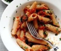 "Obroty wsteczne" /obr. 1 Sprawdzić czy makaron jest ugotowany al dente. Odcedzić makaron, przełożyć do naczynia z sosem, dodac pietruszkę dobrze wymieszać, w razie potrzeby doprawić