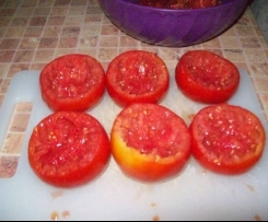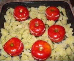 Pomidory umyc, osuszyc, odciac gòrna czesc ( przykrywka). Odciete czesci odlozyc. Pomidory wypròznic (odlozyc do miseczki miazsz, razem z sokiem), posolic w srodku, poukladac w durszlaku do gòry nogamy, by odciekly. W tym czasie obrac ziemniaki, umyc, osuszyc, pokroic na dosc duze kawalki, ulozyc w Varomie. Do koszyczka wlozyc ryz. Do