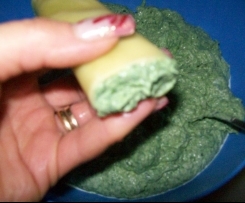 Makaron wrzucic na 2min do goracej wody, odcedzic, ulozyc na czystej sciereczce. Szpinak ugotowac, dobrze odcisnac. Do