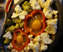 "Blokada naczynia miksującego" wlewamy wodę, sypiemy sól ( 1 łyżka lub jak to woli) wkładamy koszyczek, nastepnie ziemniaki, zamykamy pokrywę, na dolnej Varomie wkładamy przygotowanego kurczaka (razem w folii), nakładamy górną Varoma wycinamy na dno owal z papieru do pieczenia, na to kładziemy kółka z papryki wbijamy w nie po jednym jajku i dookoła rozkładamy warzywa, wszystko solimy, pieprzymi, na jajka szczypiorek kładziemy, zakładamy pokrywkę, ustawiamy 35 min/Varoma/stufa 1Gotowe danie można do smaku posypać koperkiem