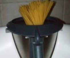 "Blokada naczynia miksującego" wlozyc czosnek, obrany: 5sek / obr 4. Dodac olej: 3min / 100° / obr 1. Dodac lososia, karczochy, mleko, przecier: 5min / 100° / obr 1. Dodac wode i sòl: 8min / 100° / obr 1. Dodac spahetti: 8-12min ( czas na op. + 2-3min, jesli potrzeba). 2min przed koncem dodac oliwki. Podawac posypane pietruszka.