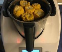 Do ugotowania większej ilości kukurydzy - wystarczy nałożyć przystawkę Varoma i w niej umieścić tyle kolb w całości lub pociętych - ile się zmieści.