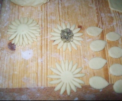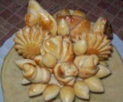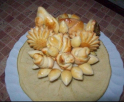 "Blokada naczynia miksującego" wlozyc mozzarelle: 3sek / obr 5. Jajka (lub kurczaka), ugotowac na twardo, odlozyc. Przygotowac farsz do pieczenia: zmielone pieczarki polaczyc z serem i mozzarella, doprawic sola, pieprzem. Tym farszem mozemy napelniac kwiatki, paszteciki, rogaliki.... , Kròre bedziemy piec w piekarniku. Pozostaly farsz doprawiamy majonezem, mozemy dodac pokrojone w kosteczke jajka, badz kurczak, groszek, badz kukurydze. Ten farsz bedzie potrzebny do nadziewania, bez pieczenia.Ciasto rozwalkowac. Dostosowac do wybranej wg gustu foremki, naoliwionej, posmarowac zòltkiem, piec w goracym piekarniku: 180° / do zrumienienia, wyjac , ostudzic, zdjac z formy. W miedzyczasie wycinac , formowac ròzne kwiatki, listki, nadziewac nadzieniem, ktòre sie da. Z reszty porobic paszteciki, cornetti... itd. Sklejac potrzebne czesci bialkiem, wszystko posmarowac zòltkiem. Nastepnie pieczemy kwiatki i inne dodatki.