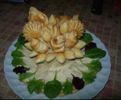 Komponujemy wszystko: Scinamy troche srodek naszej formy, " zatykamy" nim dziure w formie, by nadziac tam pòzniej patyczki z kwiatkami. Wkladamy kwiatki. Podstawe formy smarujemy majonezem, dekorujemy salata. Nakladamy wczesniej przygotowany farsz. Dekorujemy pasztecikami, posiekanym zòltkiem, pomidorkami, salata.... Itd.