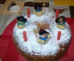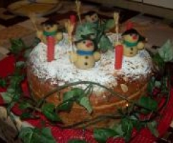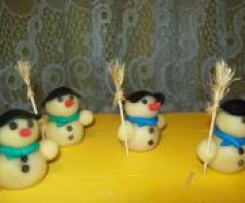 Po wystudzeniu ciasto posypać cukrem pudrem, i zabrać się za zabawę z bałwankami - jak na załączonych poniżej zdjęciach. Kołacz udekorować figurkami bałwanków z masy marcepanowej i można cieszyć oczy myśląc o świętach.
