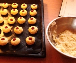 "Blokada naczynia miksującego" , zgarnąć kopystką wszystko do środka, dodać białka i nadal mieszać urzywając kopystki 2min/obr.4.5. Zrobić małe kulki z dziurką (jak na kluski śląskie), do dziurki nałożyć marmoladę i piec 20min w piekarniku nagrzanym do 180C