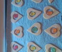 Rozgrzać piekarnik, ciasto rozwałkować wykroić  duże ciasteczka, a w środku każdego np.nakrętką z buteli małe otwory. Do każdego włożyć landrynkę.