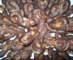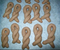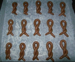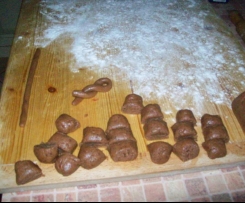 "Ciasto" , wyjac. Wyrobic lekko rekoma. Podzielic ciasto na 48 czesci. Z kazdej czesci zrobic waleczek o dl. ok. 20cm; zlozyc na pòl, "zwinac w supelek". Ulozyc na blaszke, piec w nagrzanym piekarniku: 180° / 10-12min. az troszke stwardnieja. Wystudzic kompletnie. Czekolade przeznaczona na polewe, rozpuscic w wodnej kapieli, wystygle supelki maczac w czekoladzie, tylko z wierzchniej strony. Mozna przyozdobic grubo posiekana skòrka pomaranczowa.