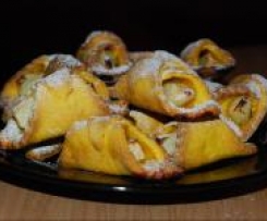 Tak przygotowane ciasto zawiń w folię i umieść w lodówce na jedną godzinę aby się schłodziło - będzie lepiej się wałkowało. W międzyczasie przygotuj stolnicę i wałek. Rozgrzej piekarnik do 180 stopni. Obierz jabłka ze skórki. Wytnij gniazda nasienne i podziel każde z jabłek na 8 części - (najlepsze będą jabłka średniej wielkości). Kiedy już masz schłodzone ciasto urwij kawałek, rozwałkuj na pasek o szerokości około 5 cm i grubości 2-3 mililetry , wytnij z niego nożem lub radełkiem ozdobnym kwadraty 5 na 5 centymetrów (tak jak na pierogi). Na środku każdego z nich ustaw kwałek jabłka (możesz delikatnie posypać go cynamonem) i połącz naprzciwległe dwa rogi nad jabłkiem (patrz zdjęcie). Tak przygotowane ciasteczka przenieś na blachę do pieczenia. Gdy już ułożysz całą blachę (nie trzeba ich specjalnie rozsuwać - nie rosną zbyt duże) umieść w rozgrzanym piekarniku i wypiekaj (około 15 min.) aż się zarumienią. Po upieczeniu i wyjęciu ich z piekarnika od razu zsuń je na deskę lub inną blachę. (Ułatwi to ich zdjęcie, bo gdy wystygną na blaszce, na której pieczesz istnieje duże ryzyko, że się będą trudno odklejać - a to za sprawą soku z jabłka, który podczas pieczenia wypłynie i może wpłynąć pod ciastka). Z podanej porcji ciasta wyjdzie około 24 ciasteczka. Do dekoracji użyj cukier puder.Szybko się je robi - równie szybko znikają. Są bardzo smaczne i tanie. Dla mnie stanowią rozwiązanie problemu pozostającego miąższu z marchewek