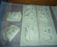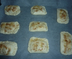 Gotowe ciasto francuskie dzielimy na 8 części, na każdy kawałek nakladamy farsz w taki sposób, aby brzegi zostały bez nadzienia, składamy na pół i sklejamy zawijając brzegi do środka. Każdy kawałek smarujemy białkiem, posypujemy cukrem brązowym i cynamonem i na każdym kawałku robimy dwa nacięcia nożem na środku.