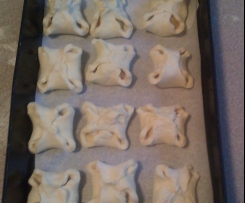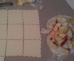 Wyłożyć na stolnicę lekko opruszoną mąką. Zagnieść,rozwałkować na grubośćok 0,4mm i wykrawać kwadraty o boku ok 7-8cm. Na środek każdego kwadratu układać kawałki jabłka, gruszki, brzoskwini lub łyżeczkę masy makowej. Złączyć rogi ciastka nad nadzieniem. Piec w temp. 180*C czas 30-35 min.