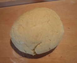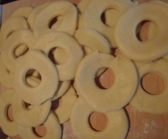 "Ciasto" .2. Z ciasta formujemy kulę, odkrajamy kawałek i wałkujemy na 2-3 mm. Wykrajamy kółka większą szklanką, a w środku mniejsze kółeczko kieliszkiem.