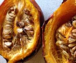 1. piekarnik rozgrzać do temp. 190 st termoobieg, dynię przekroić na pół, rozkruszyć odrobinę oleju kokosowego na każdą połówkę, położyć na blasze skórka do dołu, piec 50 min, wystudzić, oddzielić miąższ od pestek i skóry (jeżeli skóra nie jest przypalona można ją również wykorzystać do ciasta