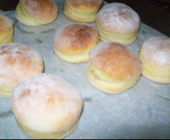 "Ciasto" . Przelozyc do miski, zostawic do wyrosniecia ( 1-2h). Podsypac maka, rozwalkowac, wykrawac dowolne formy ( moje sa kòlka), nakladac nadzienia, sklejac kòlka po 2, kilka kòlek upiec bez nadzienia ( beda napelniane bita smietana) ( jak na zdjeciach), zostawic jeszcze 10-15min do wyrosniecia. Piec w nagrzanym piekarniku: 180° / 10-15min ( zalezy od piekarnika). Ja jedne nadzialam musem jablkowym, drugie suszonymi sliwkami, trzecie bita smietana, wszystko posypalam cukrem pudrem. Najlepsze sa cieplawe.